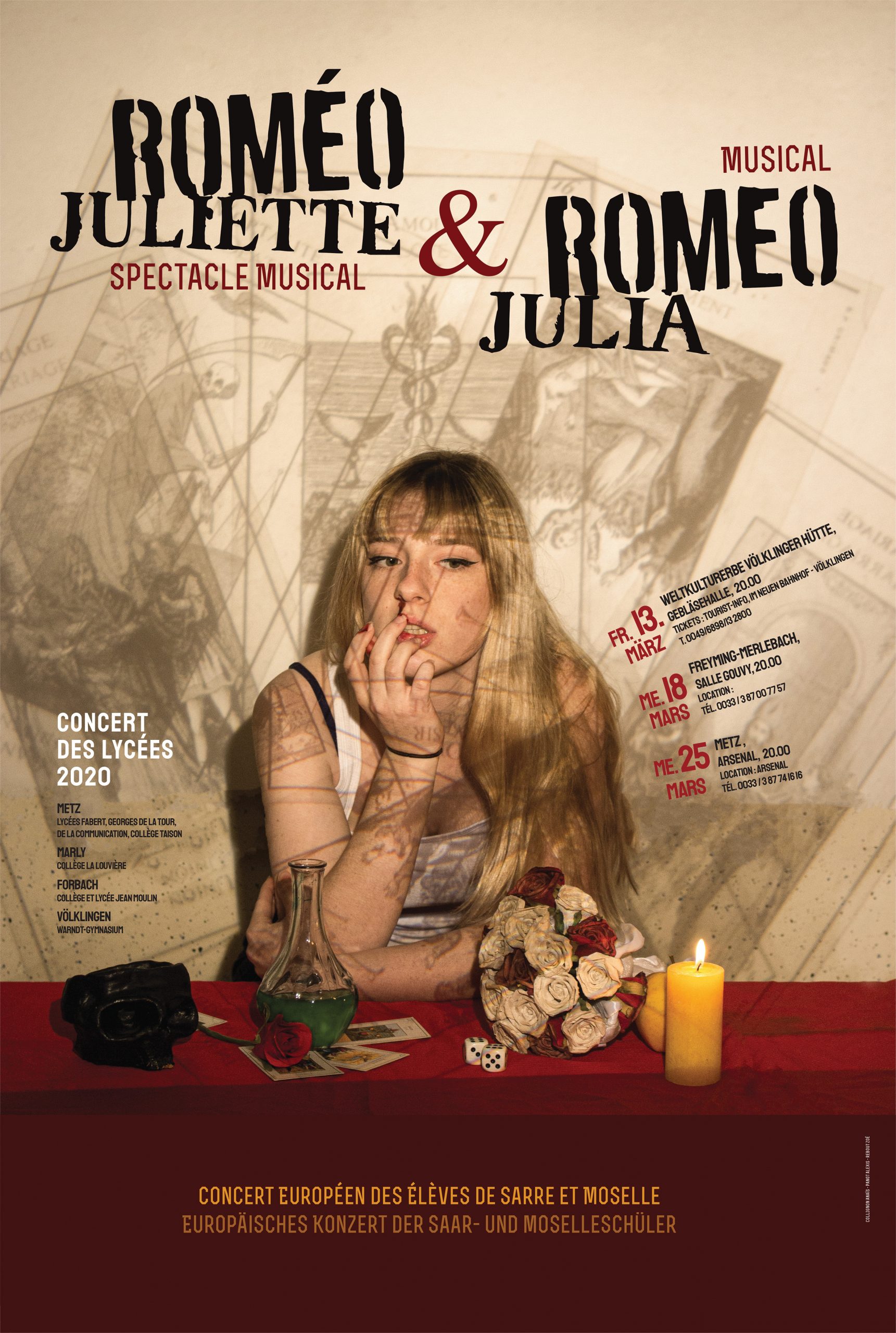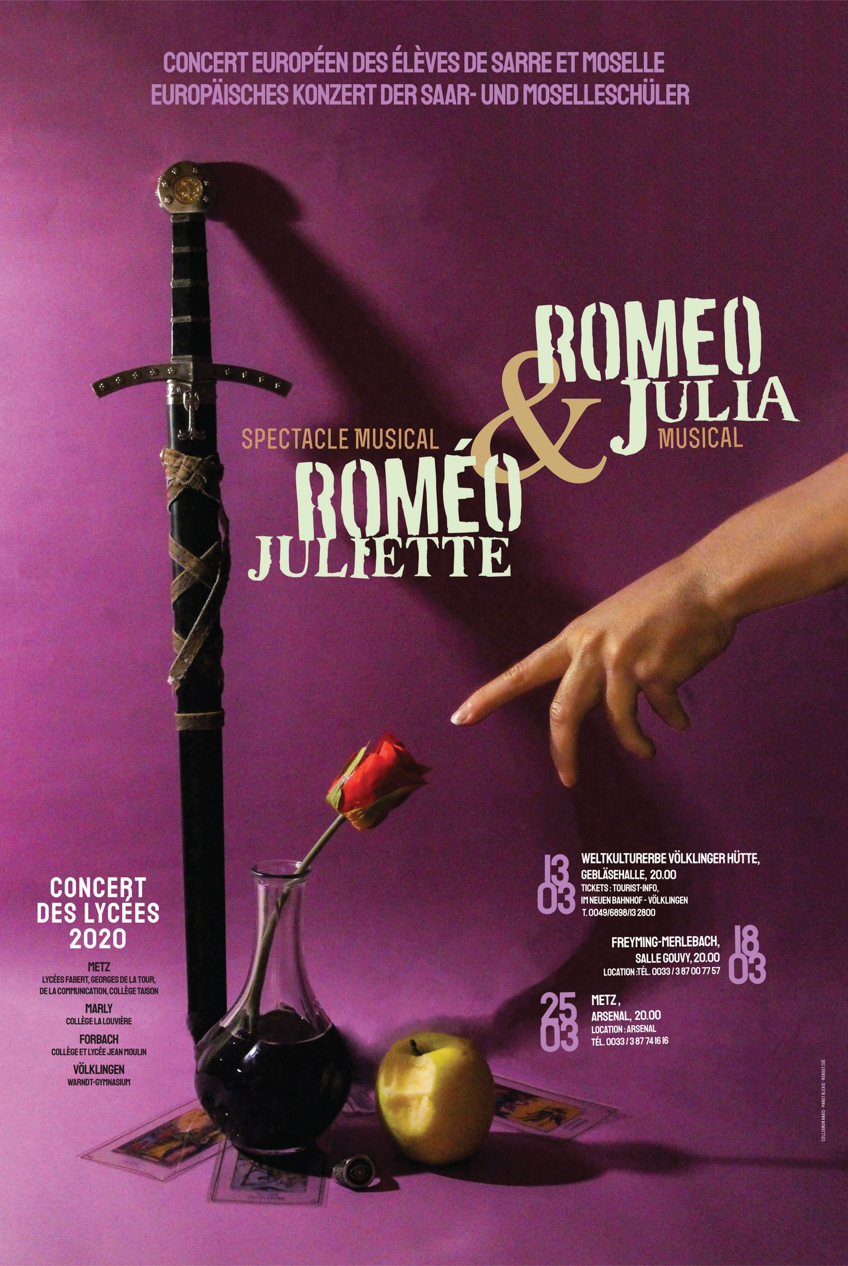 Propositions de deux affiches pour le concert des Lycées 2020 regroupant les lycées et collèges de Metz, Marly, Forbach et Völklingen en Allemagne. Le thématique de cette année étant Roméo et Juliette.