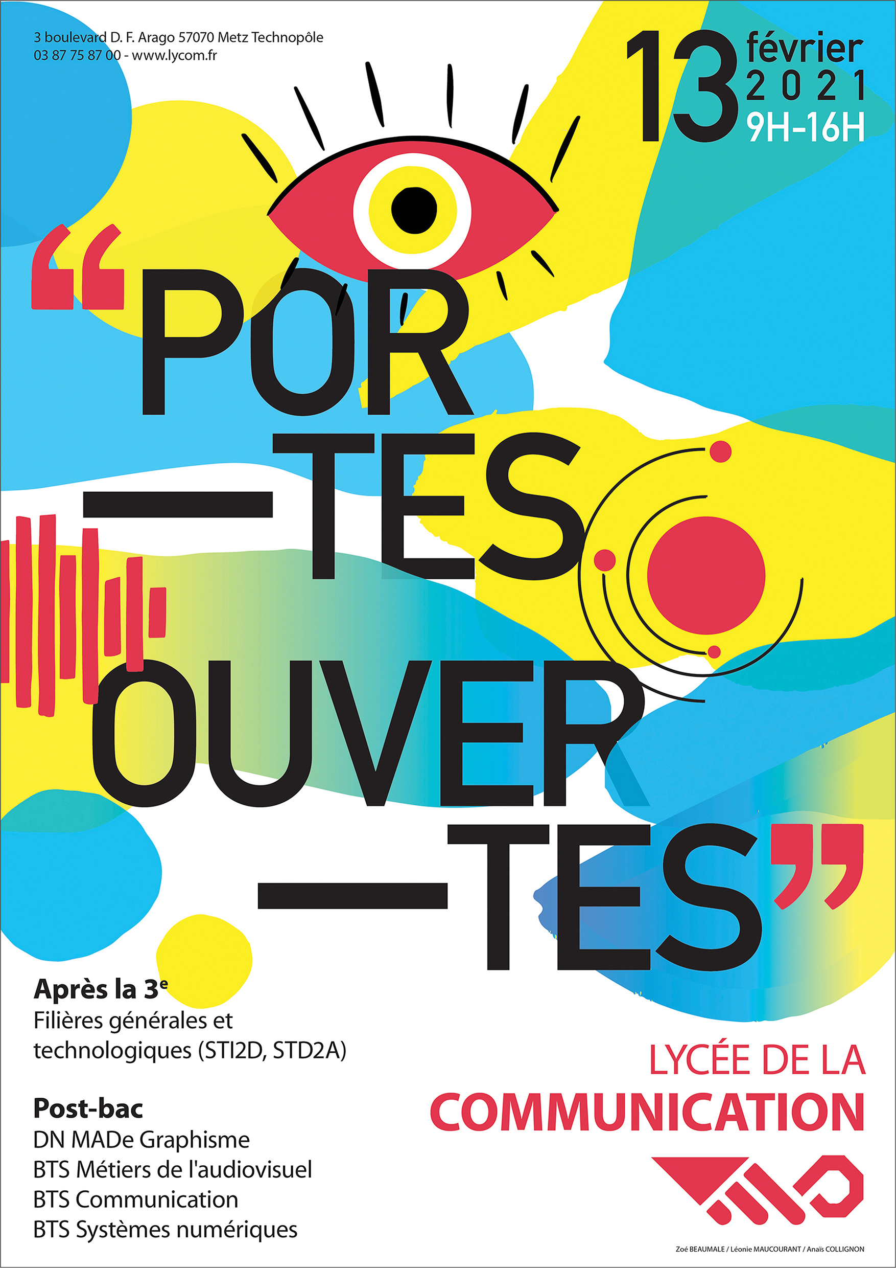 journées portes ouvertes lycom lycée de la communication metz signalétique identité visuelle jpo graphisme design graphique étudiante en design graphique anaïs collignon affiche flyer goodies totebag badge dépliant brochure print édition communication visuelle 2020 2021 dnmade illustrator photoshop indesign
